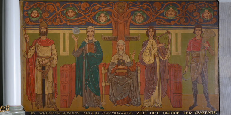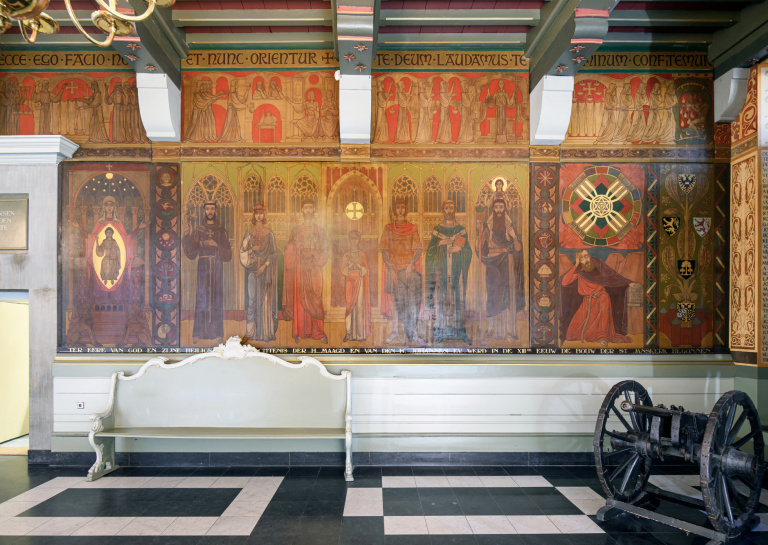 In de hal van het stadhuis van ‘s-Hertogenbosch hangen aan beide zijden van de hal indrukwekkende schilderijen van de Nederlandse kunstenaar Antoon Derkinderen. Deze monumentale werken, elk met een oppervlakte van maar liefst 50 vierkante meter, zijn in opdracht gemaakt als twee afzonderlijke stukken. De eerste muur werd voltooid in 1892 en de tweede in 1896. De stukken die momenteel hier in het atelier te zien zijn, maken deel uit van de zogenaamde ‘Tweede Bossche Muur’, die normaal gesproken aan de rechterkant hangt als je de hal binnenkomt.