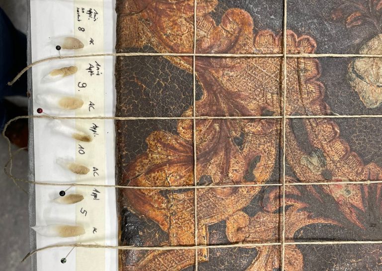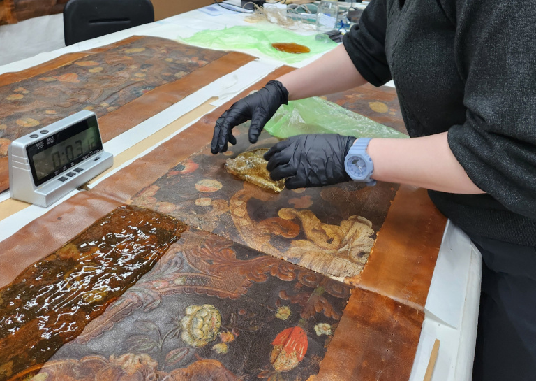 The restoration is currently in full swing. At the studio in Maastricht, a large team of conservators is diligently working on the gold leather panels. The process consists of several phases. First, the leather panels are separated by carefully opening the seams, and consolidation is applied where necessary to prevent material loss. Next, the back is cleaned, and any glue residue is removed. The front is treated with a Borax-PVA gel, effectively removing surface dirt in a controlled manner.
