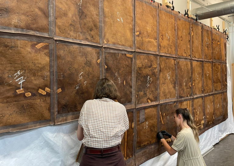 Some panels are warped, and these distortions are corrected through a careful process of controlled humidifying and the application of pressure to flatten the leather. The SRAL gold leather team works collaboratively, alternating and complementing each other’s skills. All 92 leather panels—covering a total of 39 m²—will be fully restored. After restoration, a number of steps followed in the treatment including installing new connectors between the panels, rejoining the leather sections, setting up a hanging system, and finally returning the panels to Den Bosch.