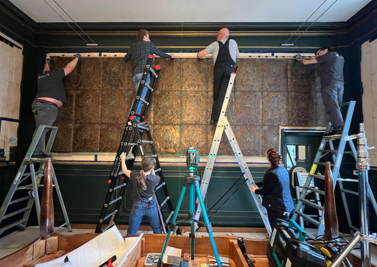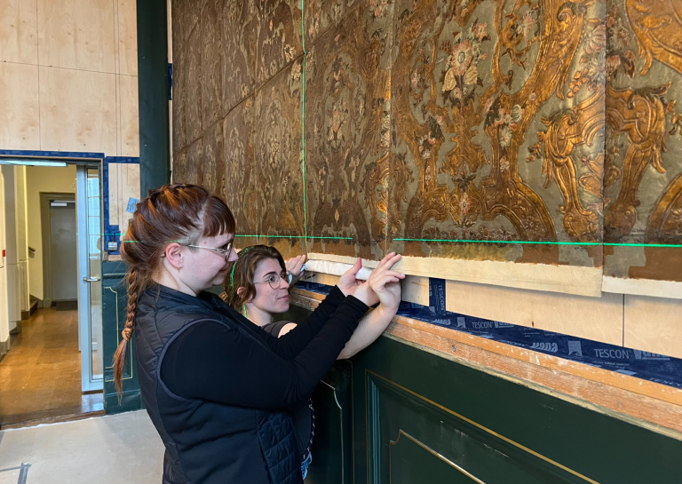 On 22 and 23 April, the restored gilt leather wallpaper from the 'Wethouderskamer' (Aldermen's Room) in the Town Hall of 's-Hertogenbosch was reinstalled. Subsequently, the gilt leather wallpaper from the 'Burgemeesterskamer' (Mayor's Room) was removed and transported to our workshop in Maastricht. Work on this will continue over the coming year.